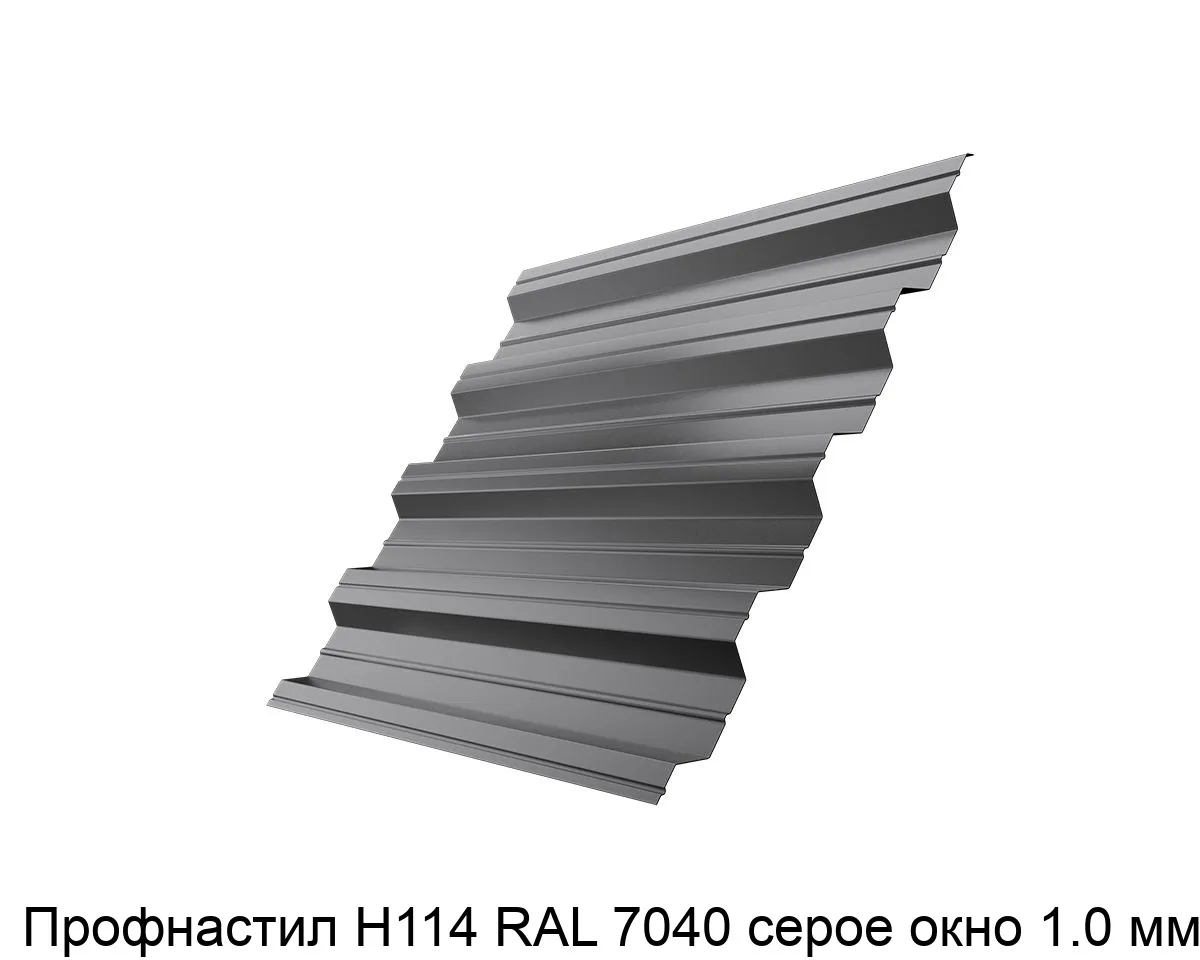 Профнастил Н114 RAL 7040 (серое окно) изготавливается из оцинкованной стали толщиной 1 мм. Он применяется в строительстве для облицовки фасадов зданий, возведения заборов, создания кровли.