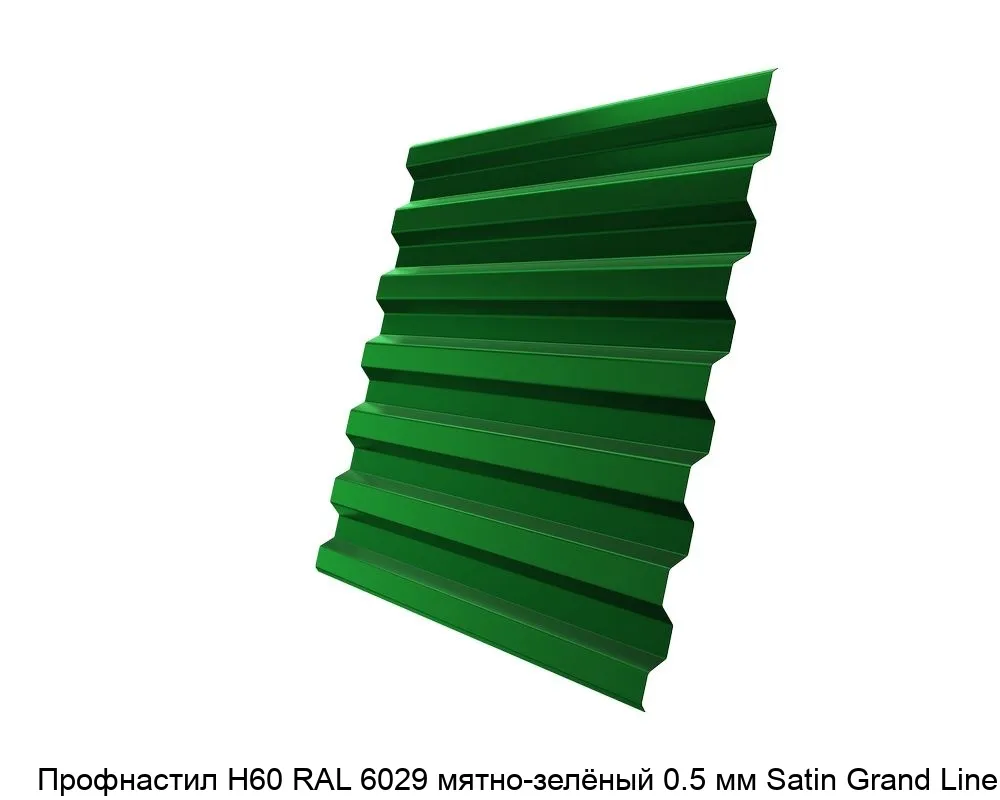 Купить профнастил Н60 RAL 6029 мятно-зелёный 0.5 мм Satin Grand Line в Москве вы можете в компании Сортмет. Для этого оформите заказ на сайте или по телефону 8 (495) 123-30-40. На нашем складе всегда в наличии большой ассортимент металлопроката, лучшие цены и быстрая доставка.