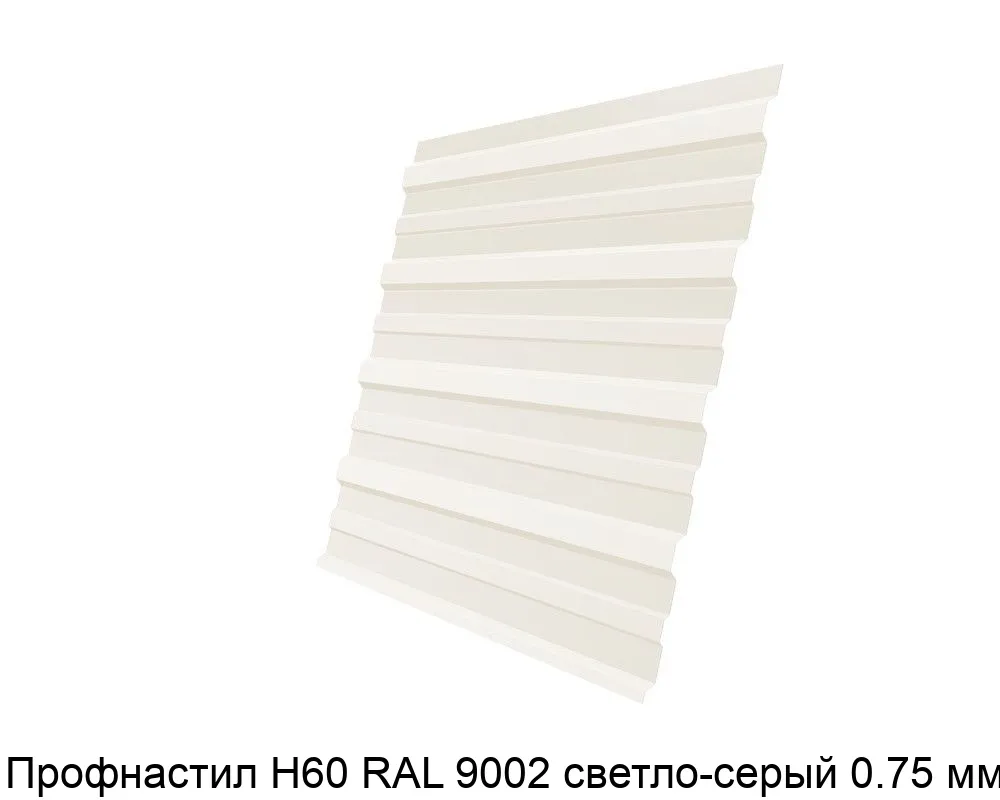 Купить профнастил Н60 RAL 9002 светло-серый 0.75 мм в Москве вы можете в компании Сортмет. Для этого оформите заказ на сайте или по телефону 8 (495) 123-30-40. На нашем складе всегда в наличии огромный выбор металлопроката, лучшие цены и оперативная доставка.