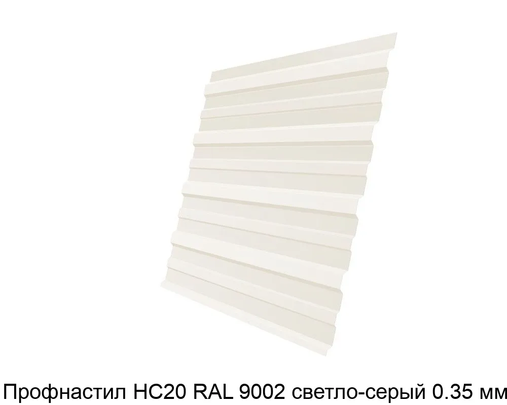 Профнастил НС20 светло-серого цвета (RAL 9002) толщиной 0,35 мм изготавливается из оцинкованной стали. Защитный цинковый слой предотвращает коррозию, а полимерное покрытие RAL 9002 придаёт листу светло-серый цвет и устойчивость к ультрафиолетовому излучению.