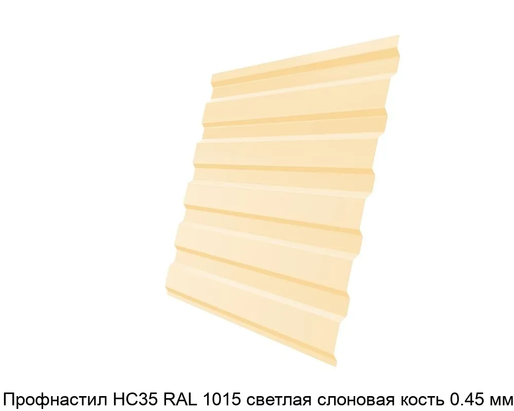 Профнастил НС35 RAL 1015 (светлая слоновая кость) изготавливается из оцинкованной стали толщиной 0,45 мм. Полимерное покрытие в цвете RAL 1015 обеспечивает защиту от коррозии и придаёт материалу светло-бежевый оттенок.