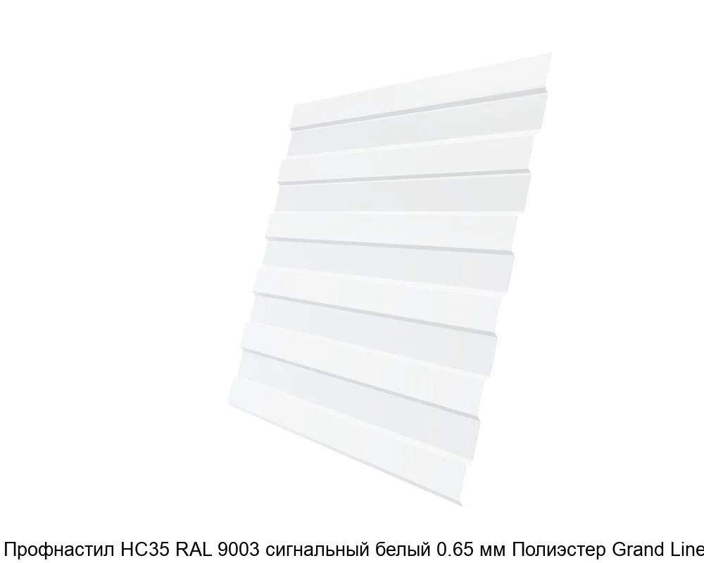 Профнастил НС35 RAL 9003 сигнальный белый 0.65 мм Полиэстер Grand Line изготавливается из оцинкованной стали, которая затем покрывается защитным слоем полиэстера. Это обеспечивает прочность, долговечность и устойчивость к коррозии.
