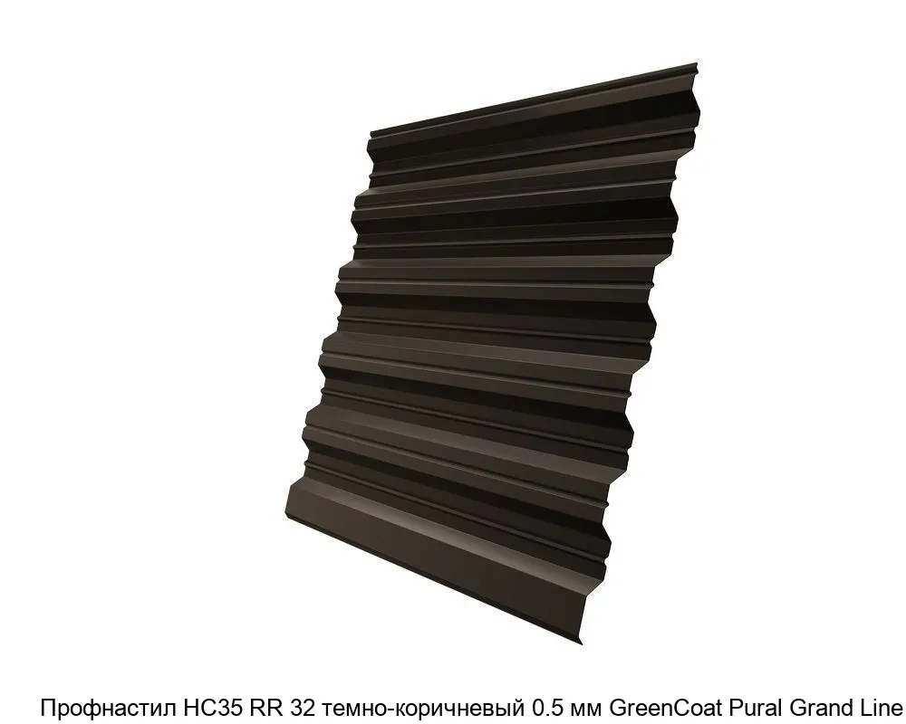Профнастил НС35 RR 32 тёмно-коричневого цвета (0.5 мм GreenCoat Pural Grand Line) изготавливается из оцинкованной стали с полимерным покрытием Pural. Этот материал обеспечивает высокую стойкость к коррозии и воздействию внешних факторов.