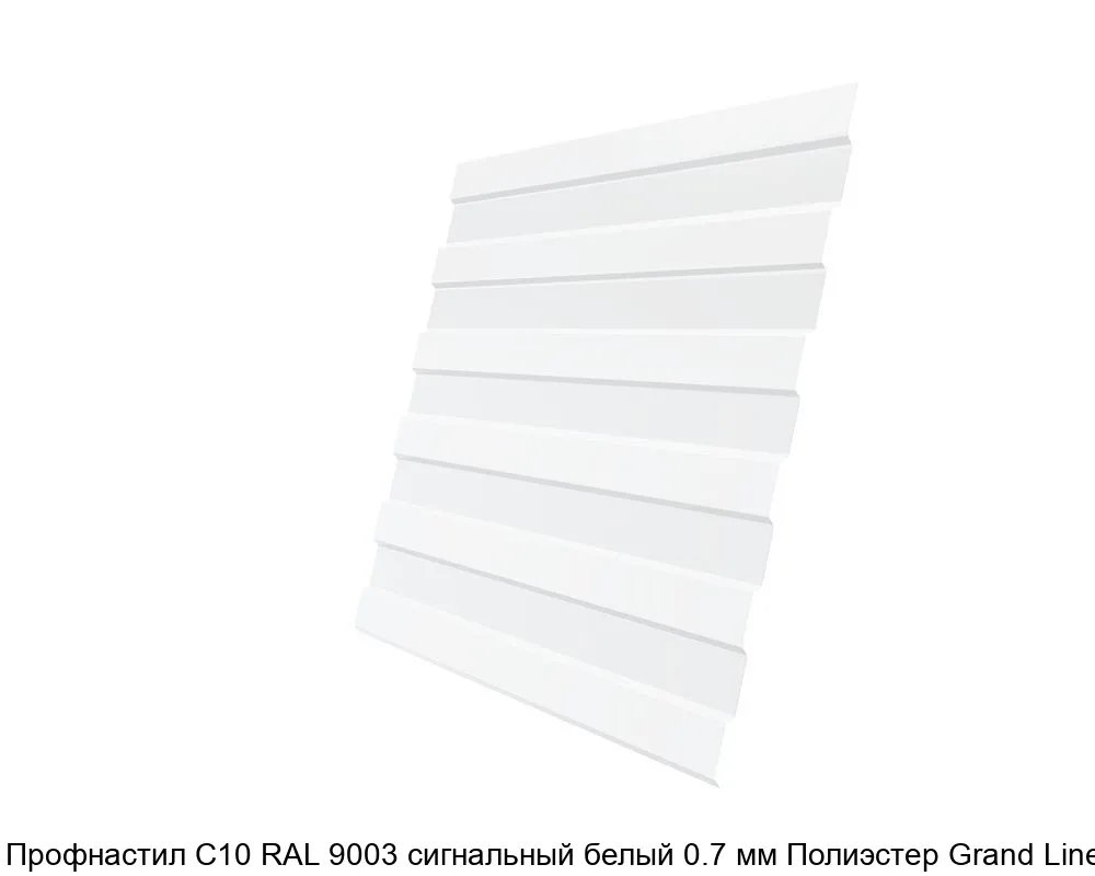 Профнастил С10 RAL 9003 (сигнальный белый) толщиной 0,7 мм с покрытием Полиэстер от Grand Line изготавливается из оцинкованной стали. Защитный слой полиэстера придаёт профнастилу прочность, долговечность и устойчивость к коррозии.