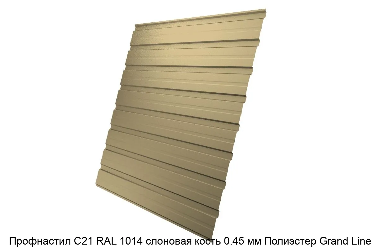 Купить профнастил С21 RAL 1014 слоновая кость 0.45 мм Полиэстер Grand Line в Москве вы можете в компании Сортмет. Для этого оформите заказ на сайте или по телефону 8 (495) 123-30-40. У нас на складе всегда в наличии широкий ассортимент металлопроката, доступные цены и своевременная доставка.