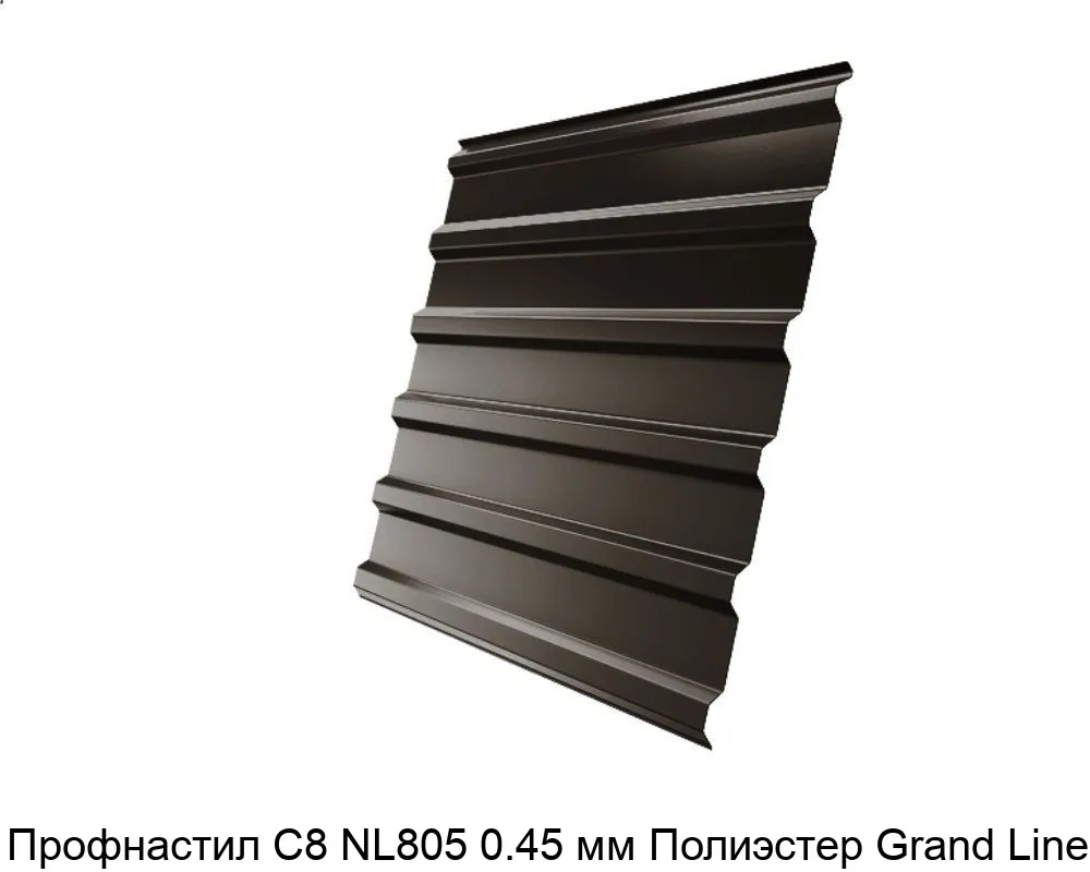 Профнастил С8 NL805 0.45 мм Полиэстер Grand Line изготавливается из оцинкованной стали, покрытой с обеих сторон защитным полимерным слоем из полиэстера. Это обеспечивает прочность, долговечность и устойчивость к коррозии.
