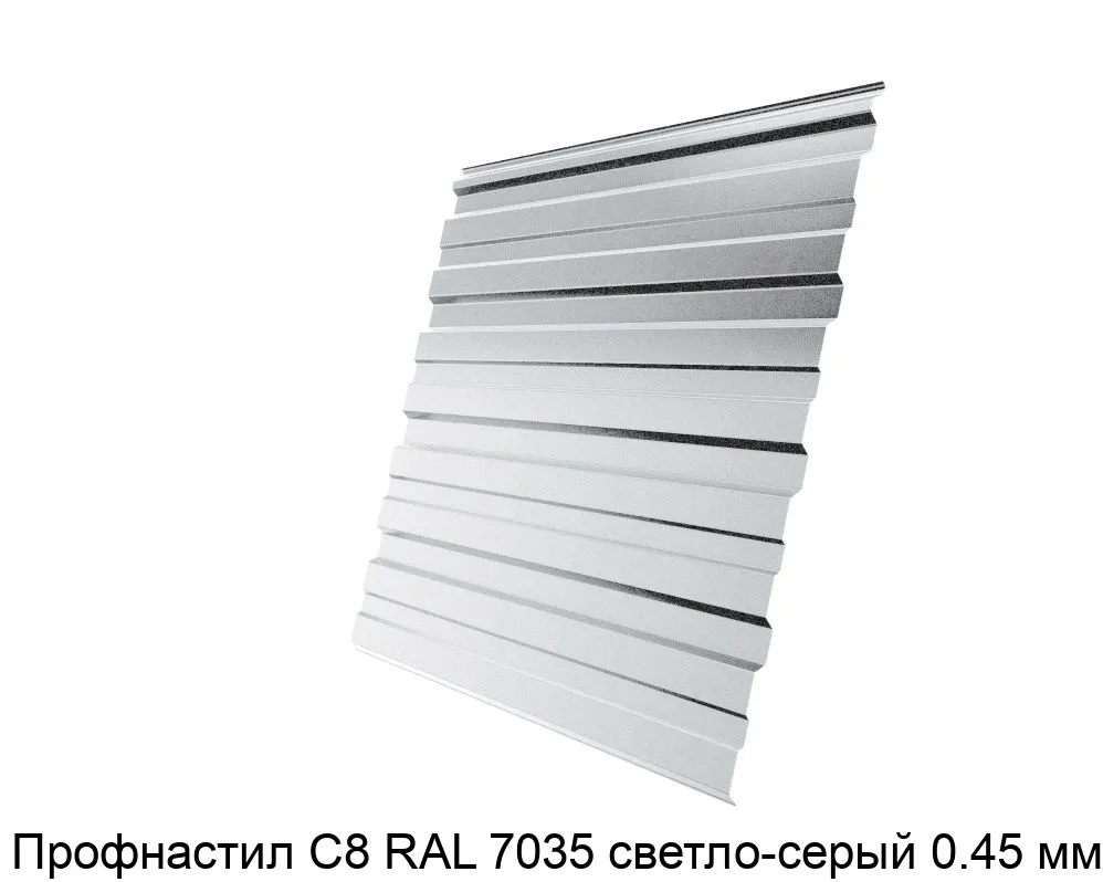 Купить профнастил С8 RAL 7035 светло-серый 0.45 мм в Москве вы можете в компании Сортмет. Для этого оформите заказ на сайте или по телефону 8 (495) 123-30-40. На нашем складе постоянно в наличии большой ассортимент металлопроката, лучшие цены и быстрая доставка.