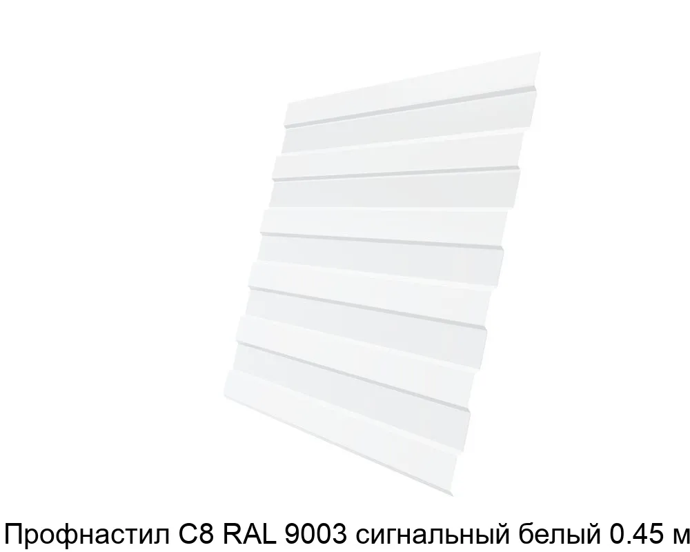 Профнастил С8 RAL 9003 сигнальный белый 0.45 мм изготавливается из оцинкованной стали, которая покрывается защитным слоем полимера. Это обеспечивает прочность, устойчивость к коррозии и долговечность материала.