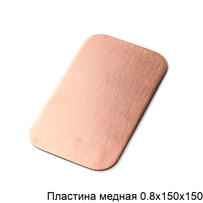Медная пластина размером 0,8 х 150 х 150 изготавливается из меди — пластичного металла с высокой тепло- и электропроводностью. Медь устойчива к коррозии и не вступает в реакцию с большинством химических веществ.