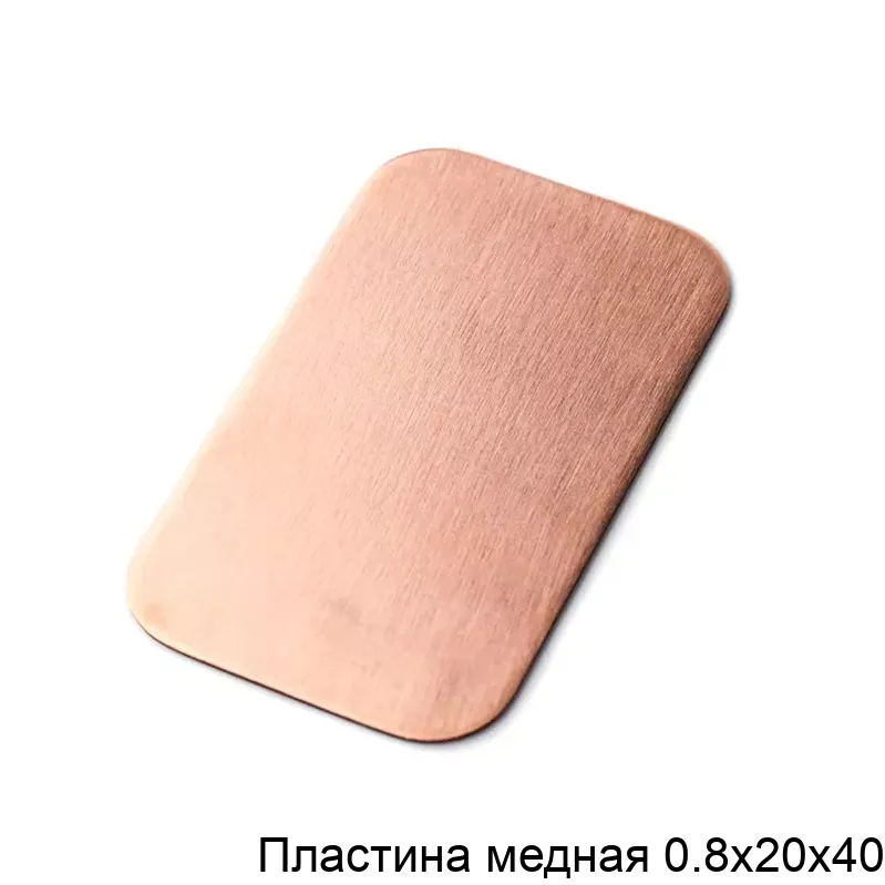 Медная пластина размером 0,8 х 20 х 40 мм изготавливается из меди — пластичного металла с высокой тепло- и электропроводностью. Благодаря своим свойствам медь широко применяется в различных отраслях.