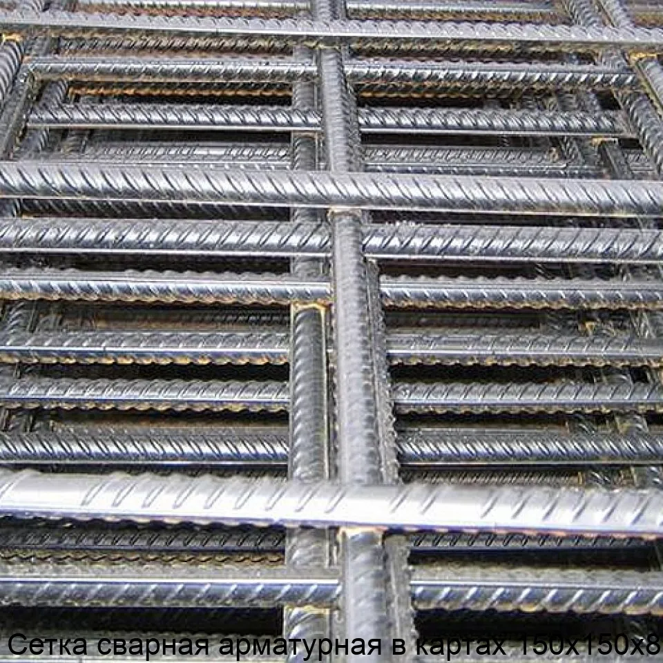 Сетка сварная арматурная в картах 150х150х8 изготавливается из стальной проволоки диаметром 8 мм, которая соединяется методом точечной сварки в пересечениях. Это обеспечивает прочность и жёсткость конструкции.