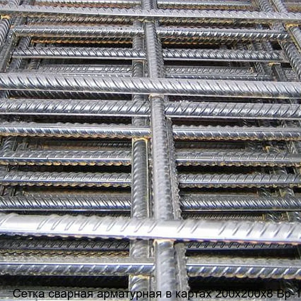 Сетка сварная арматурная в картах 200х200х8 Вр-1 изготавливается из стальной проволоки диаметром 8 мм, которая соединяется методом сварки в ячейки размером 200 х 200 мм.