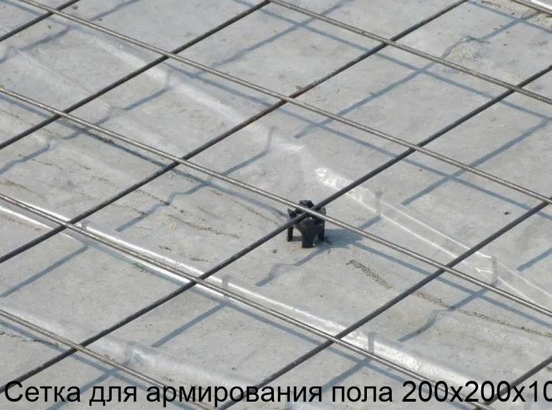 Сетка для армирования пола размером 200х200х10 изготавливается из прочного и гибкого материала — обычно это стальная проволока, сплетённая в ячейки размером 100х100 или 150х150 мм. Может иметь антикоррозионное покрытие для защиты от влаги и химических веществ.